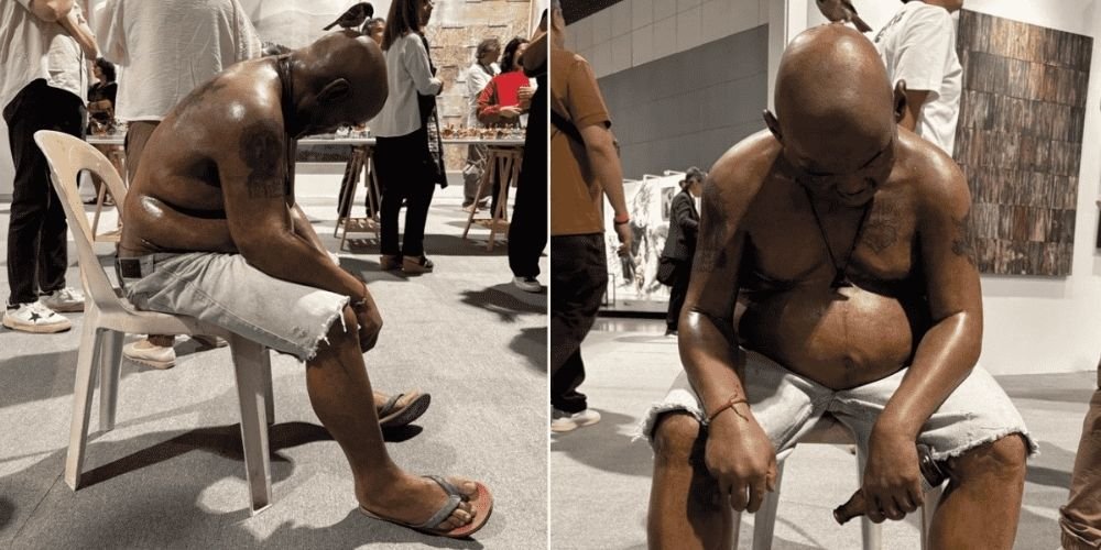 Among the works that drew sustained attention during the fair was “Weight of the Day,” a hyperrealist sculpture by Manila-based artist Lindslee, the professional name of Lindsey James Lee. Installed at the Artinformal section, the life-sized piece depicts a seated man slumped on a white monobloc chair.