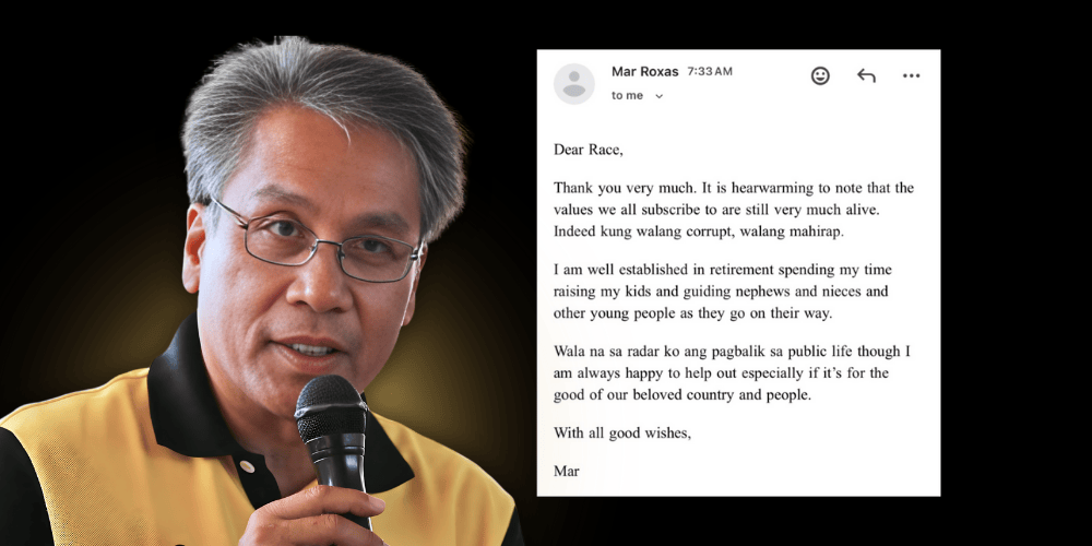 Former senator and presidential candidate Mar Roxas has confirmed that he is not planning to return to national politics. The decision came after Atty. Race Del Rosario, RN, a long-time political supporter, posted on Facebook asking whether Roxas would consider running for a national position again.