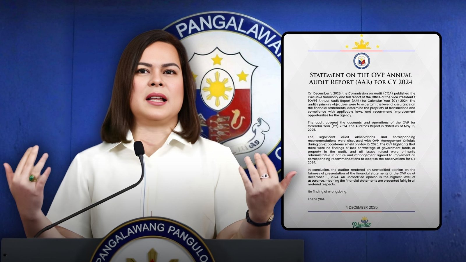 In a statement issued on Thursday, the OVP outlined that the COA found no evidence of wrongdoing and issued an unmodified opinion on the fairness of the OVP’s financial statements. “No finding of wrongdoing,” the statement declared, clarifying that the COA’s review did not reveal any substantial financial mismanagement but instead highlighted procedural matters that are being corrected.