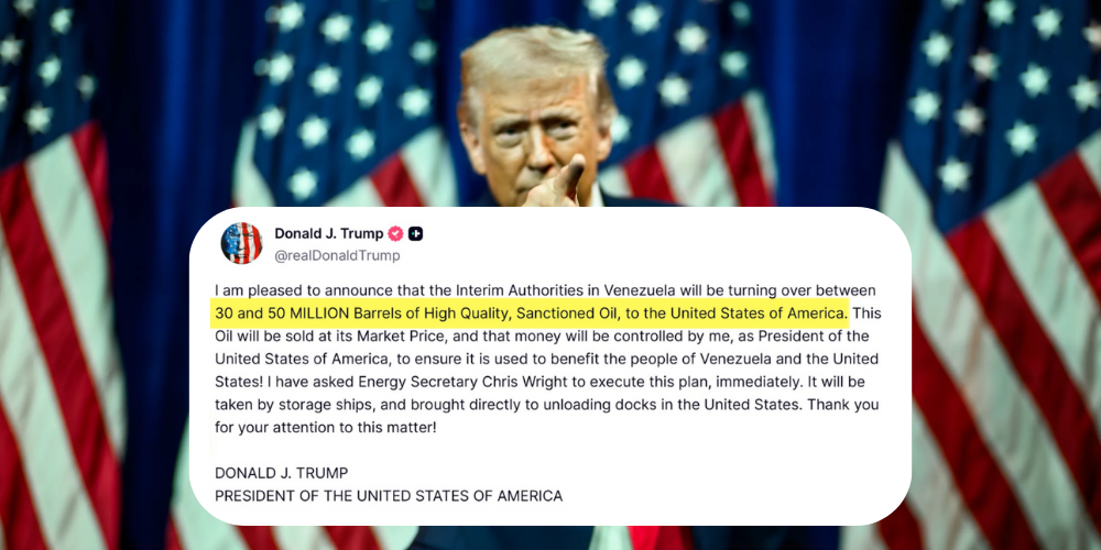 President Donald J. Trump said Venezuela will turn over between 30 and 50 million barrels of sanctioned oil to the United States following a US military operation that removed Nicolás Maduro from power.